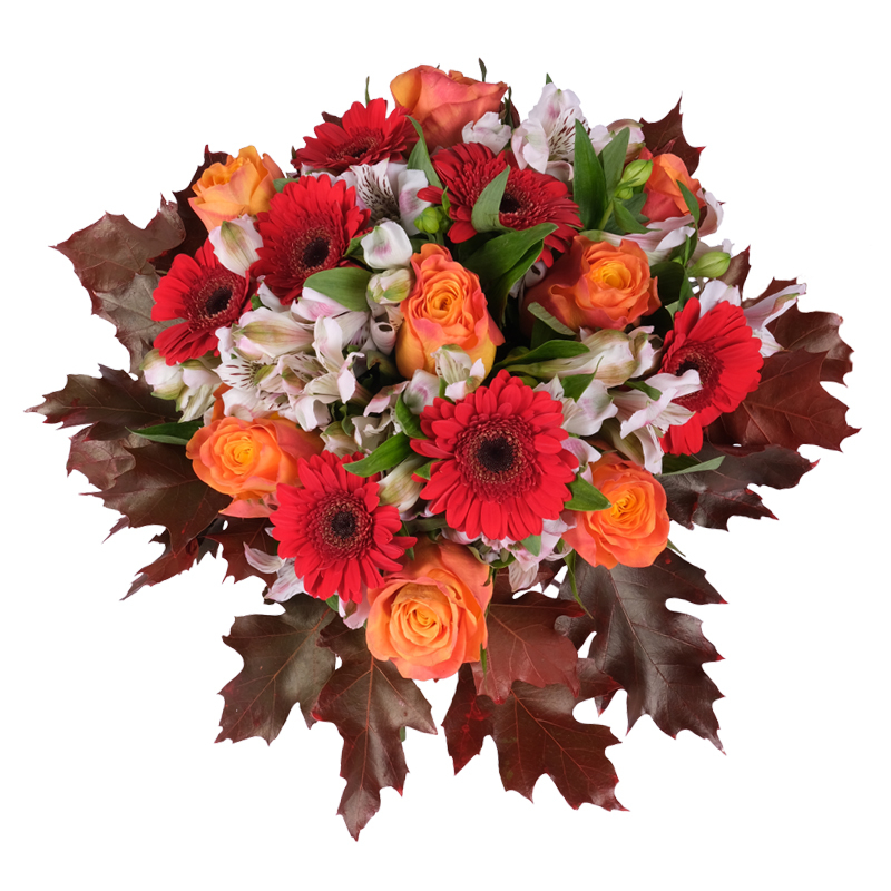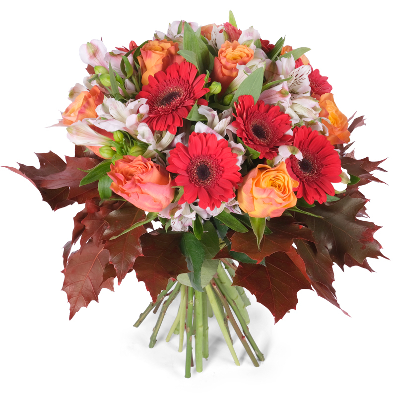 Kolorowa jesień to kompozycja inspirowana najbardziej fotogeniczną porą roku, kiedy natura pokazuje swoje najpiękniejsze oblicze. Róże, gerbery i alstromerie ozdobione jesiennymi liśćmi sprawiają, że bukiet prezentuje się imponująco. Wyślij z liścikiem bądź anonimowo!