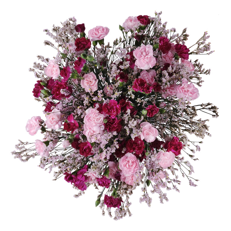 „Z nutą goździka” to bukiet nieoczywisty – prosty, ale zawsze świeży dzięki sezonowym dodatkom u boku klasycznych goździków gałązkowych.